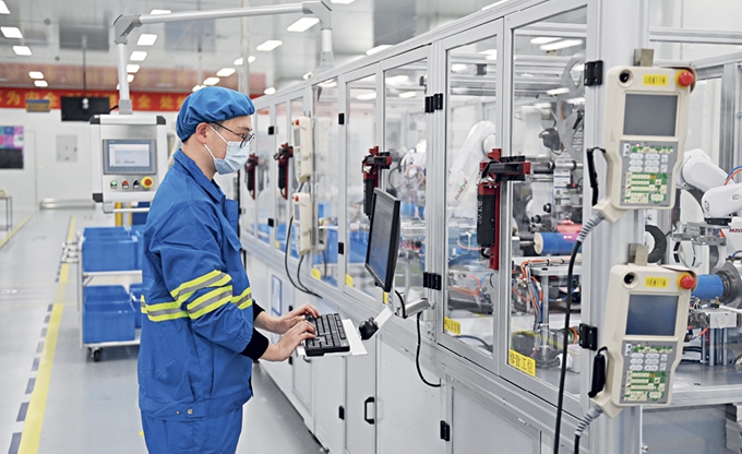 La surveillance du fonctionnement des équipements sur une ligne de production automatisée de l’usine zéro carbone de Zhejiang Qinyuan Water Treatment, à Hangzhou (Zhejiang), le 24 mars 2023