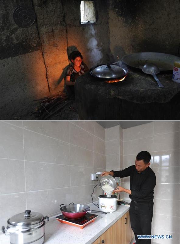 Photo combinée montrant la femme de Mou'se Laze cuisinant dans sa cuisine du village d'Atulieer, dans le comté de Zhaojue, le 12 mai 2020 (en haut) et Mou'se Laze cuisinant dans la cuisine de sa nouvelle maison située dans une communauté nouvellement construite dans le cadre de la lutte contre la pauvreté via la relocalisation de populations, dans le comté de Zhaojue de la province du Sichuan (sud-ouest de la Chine), le 13 mai 2020. (Jiang Hongjing / Xinhua)