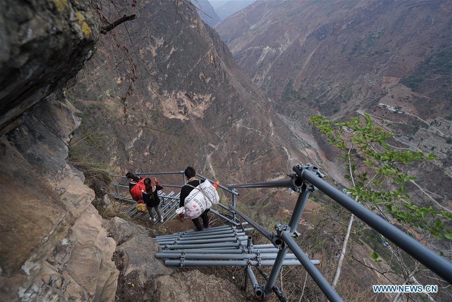 Des villageois descendent une échelle d’acier pour quitter leur village d'Atulieer et s'installer dans leur nouvelle maison située dans une communauté nouvellement construite dans le cadre de la lutte contre la pauvreté via la relocalisation de populations, dans le comté de Zhaojue de la province du Sichuan (sud-ouest de la Chine), le 13 mai 2020. (Jiang Hongjing / Xinhua)
