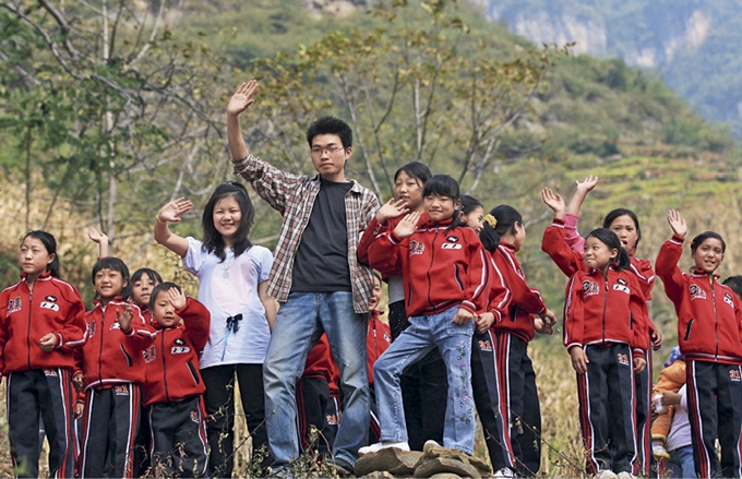 Deux enseignants entourés de leurs élèves à Hanyuan (Sichuan), le 15 octobre 2008
