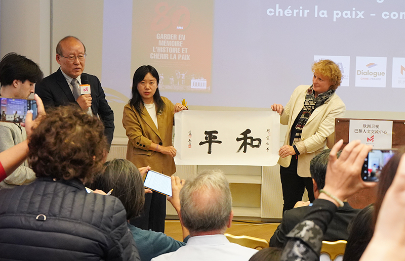 Zhao Lijun offre à Sonia Bressler une calligraphie intitulée « Chérir la Paix », œuvre spécialement créée pour ce séminaire par Lu Yushun, ancien directeur de l’Académie nationale de peinture de Chine et célèbre calligraphe-peintre.