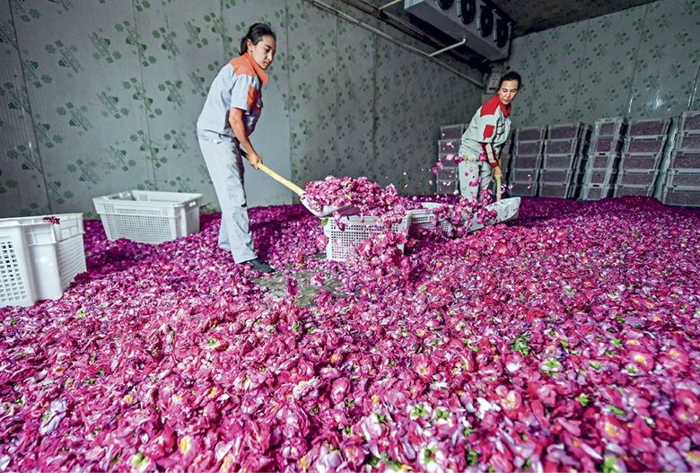 Deux femmes mettent en caisse les pétales de rose frais stockés dans un entrepôt réfrigéré, dans la préfecture de Hotan de la région autonome ouïgoure du Xinjiang.