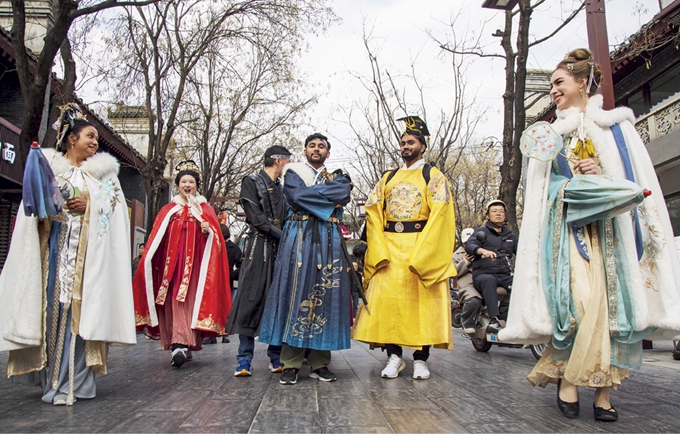 Des touristes étrangers vêtus de costumes traditionnels chinois posent à l’occasion de la fête des Lanternes dans la vieille ville de Xianyang (Shaanxi), le 3 mars 2026.