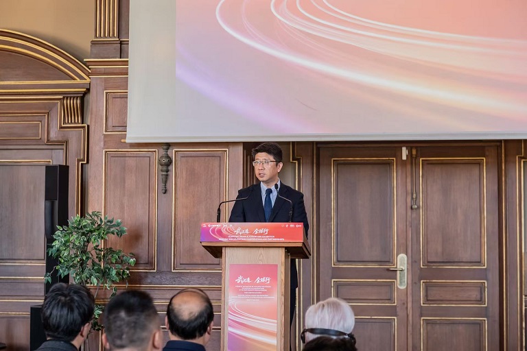 Wang Dong, ministre de l’Ambassade de Chine en France, prononce un discours.