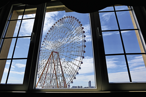 À travers une fenêtre dans le quartier Alpha, on aperçoit le ciel bleu.