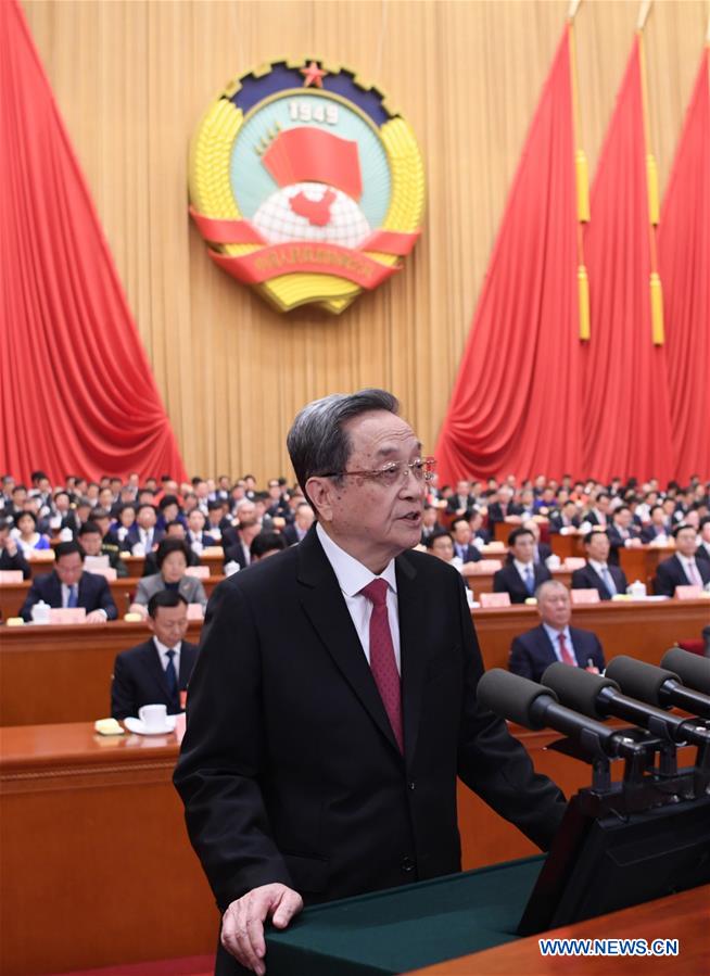 Yu Zhengsheng, président du 12e Comité national de la Conférence consultative politique du Peuple chinois (CCPPC), a présenté un rapport d'activité face à 2.149 conseillers politiques, réunis pour discuter des dossiers politiques, économiques et sociaux majeurs de la nation la plus peuplée du monde qui est également la deuxième plus grande économie mondiale.