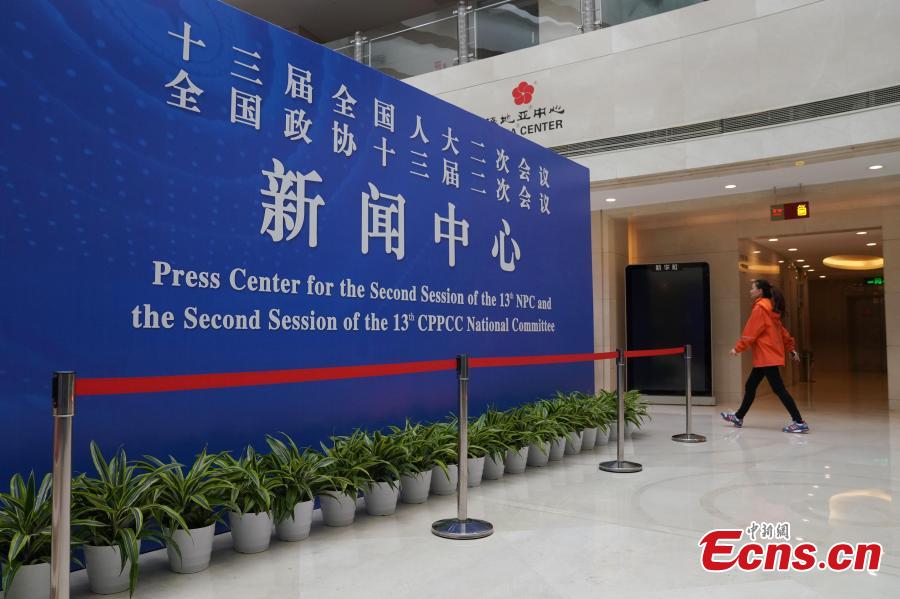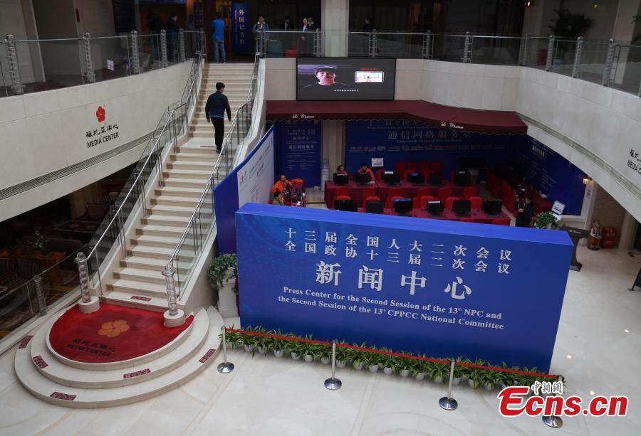 Le centre de presse de la deuxième session de la 13e Assemblée populaire nationale (APN), qui débutera le 5 mars, et de la deuxième session du 13e Comité national de la Conférence consultative politique du peuple chinois (CCPPC), qui commencera le 3 mars, est prêt. (Photo : China News Service / Cui Nan)